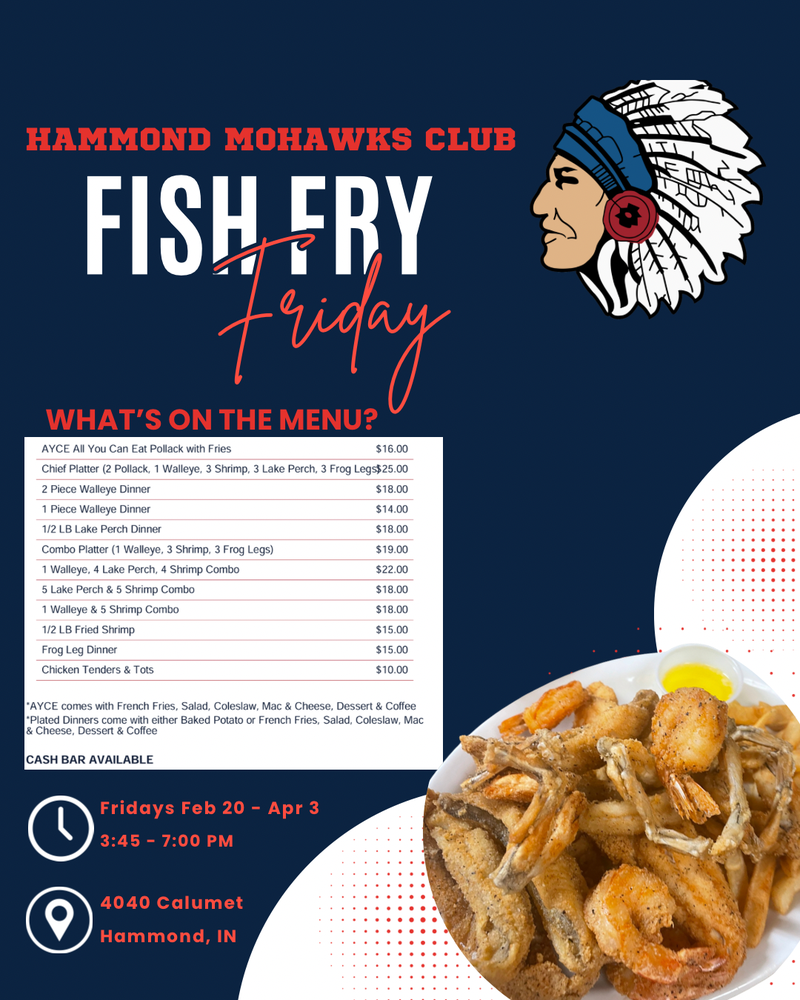 Join the Hammond Mohawks every Friday through April 3rd for Fish Fry Friday.